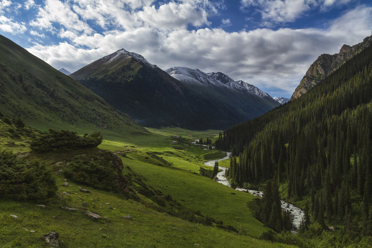 Nos adentramos en las montañas del Tian Shan,Desde Karakol, comenzamos a caminar hacia el valle de Altyn Arashan, rodeados de bosques, ríos y picos que superan los 5.000 metros.